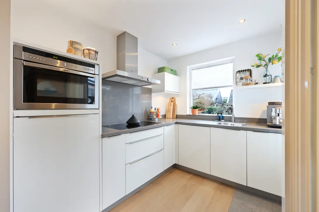 De keuken sluit mooi aan op de leefruimte en is compleet uitgevoerd met diverse inbouwapparatuur en een Quooker (2021), waardoor je hier van alle gemakken bent voorzien.