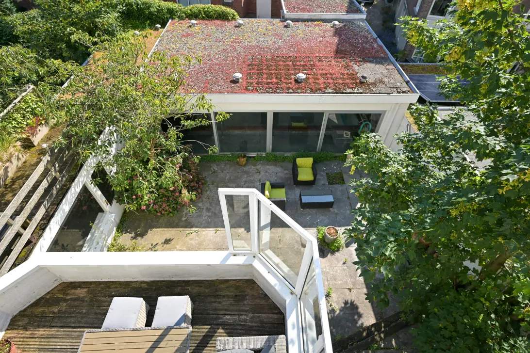 Vanaf het zonneterras een prettig vrij uitzicht en op de lager gelegen binnentuin met overdekt zwembad en sauna.