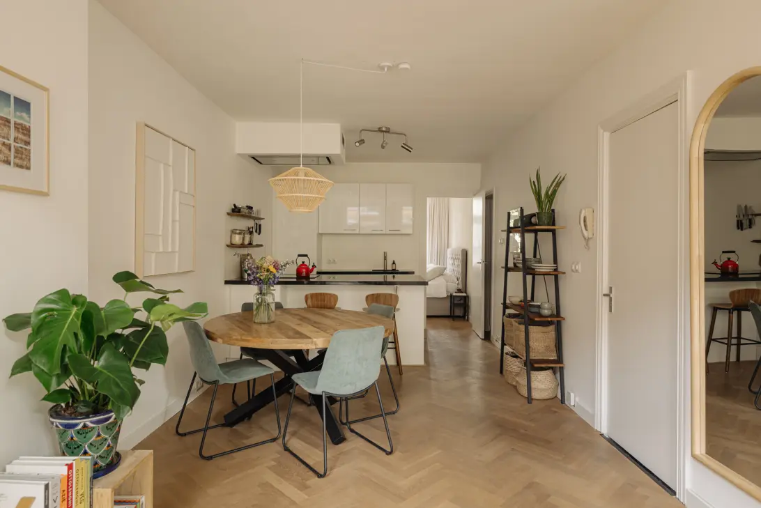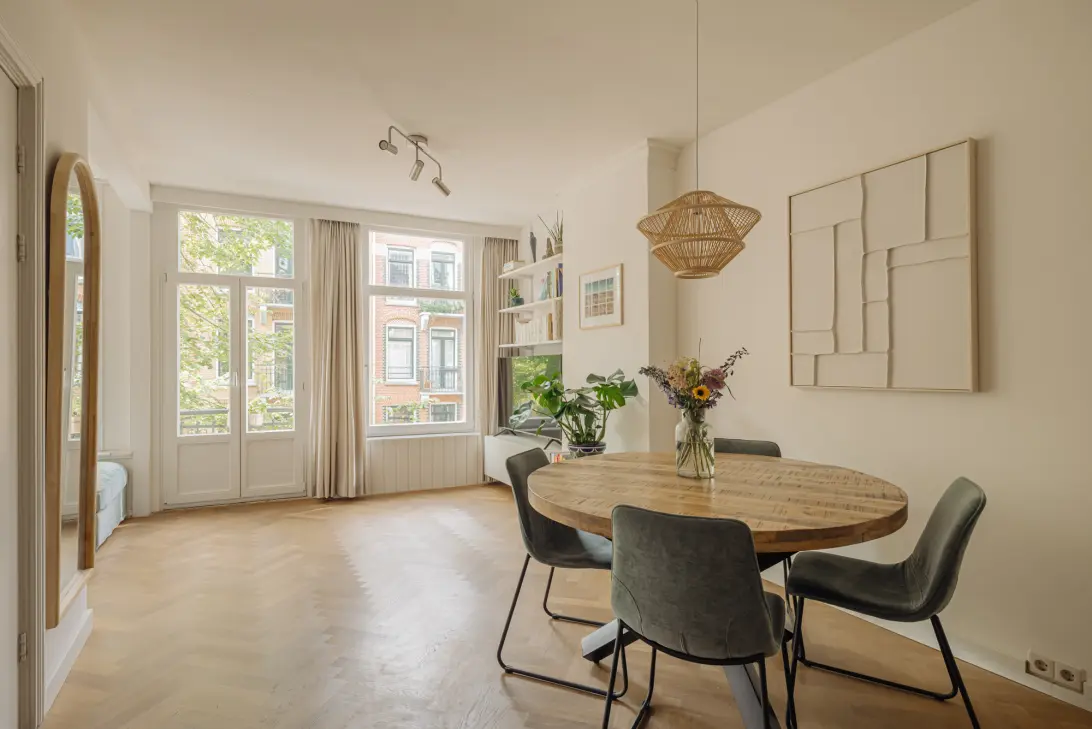 Via het verzorgde, gezamenlijke trappenhuis bereikt u de woning. Bij binnenkomst stapt u direct in de sfeervolle en lichte woonkamer met open keuken aan de voorzijde van de woning. De grote raampartijen zorgen voor een prettige lichtinval, en via het Frans balkon aan de voorzijde haalt u op zomerse dagen buiten eenvoudig naar binnen. In de woonkamer is volop ruimte voor een comfortabele zithoek én een royale eettafel. De open keuken is modern uitgevoerd en van alle gemakken voorzien: een inductiekookplaat, oven, vaatwasser, koel-vriescombinatie en veel werk- en opbergruimte maken koken hier een plezier.