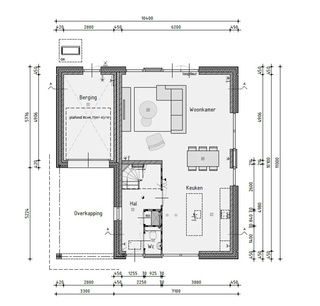 Via de voordeur stap je de hal en daarna de gezellige L-vormige leefruimte binnen. Vanachter het kookeiland heb jij zowel zicht op jouw gasten die borrelen aan tafel als op jouw kinderen die spelen in de woonkamer. Parkeren met 2 auto's kan je op eigen terrein.