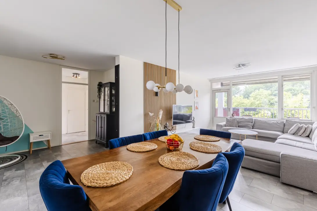 De woonkamer is ruim opgezet en uitgerust met een fraaie tegelvloer, die terugkomt in de slaapkamers. De wanden zijn hier netjes afgewerkt en deels voorzien van wandpanelen. Dankzij de brede raampartij met openslaande balkondeur aan de achterzijde, geniet de woonkamer van veel natuurlijk licht.