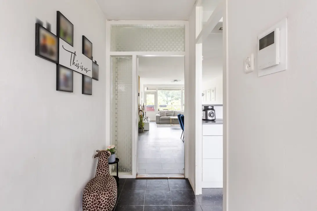 Het appartement bevindt zich op de vierde verdieping van het complex. Achter de voordeur vind je de ruime entreehal, die toegang biedt tot de woonkamer.