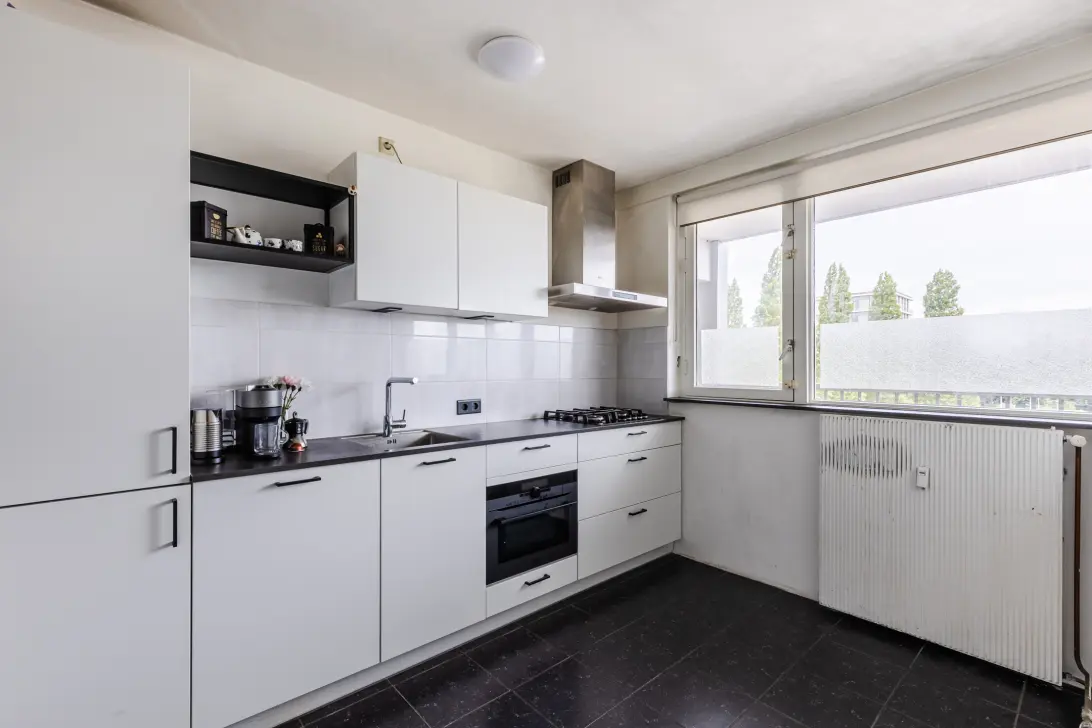 De keuken is aan de voorzijde van het appartement gesitueerd. Deze ruime keuken is vernieuwd in 2021 en bestaat uit twee keukenblokken. Het geheel heeft een strak design met witte keukenkastjes en een donker werkblad. De volgende apparatuur is hier aanwezig: vaatwasser, gasfornuis, afzuigkap, oven, koelkast en vriezer.