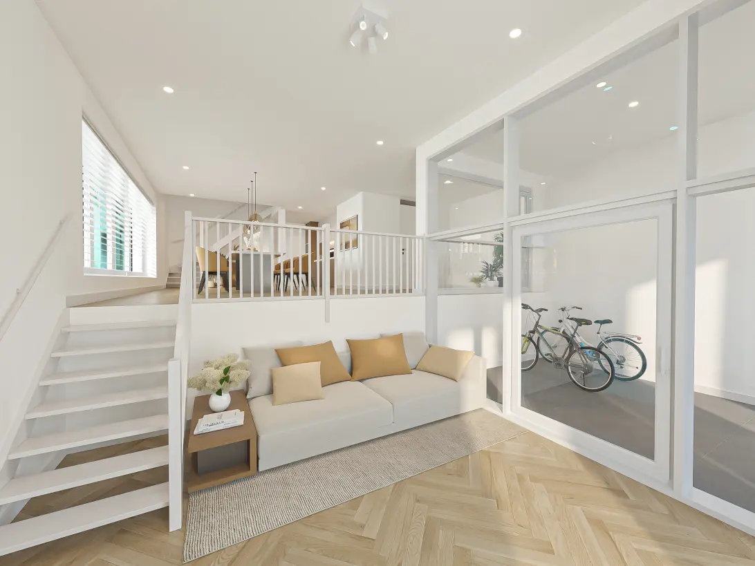 De woning ligt in het middelste en tevens laagste gedeelte van het project Vertical, verdeeld over de begane grond en de entresol verdieping.