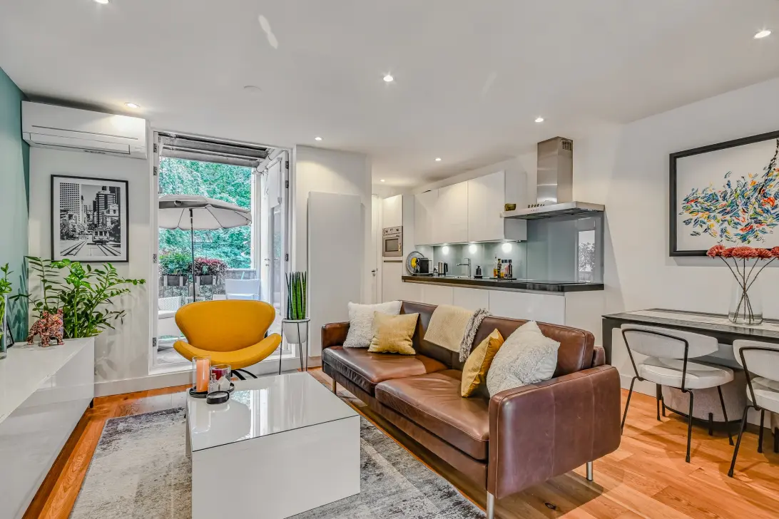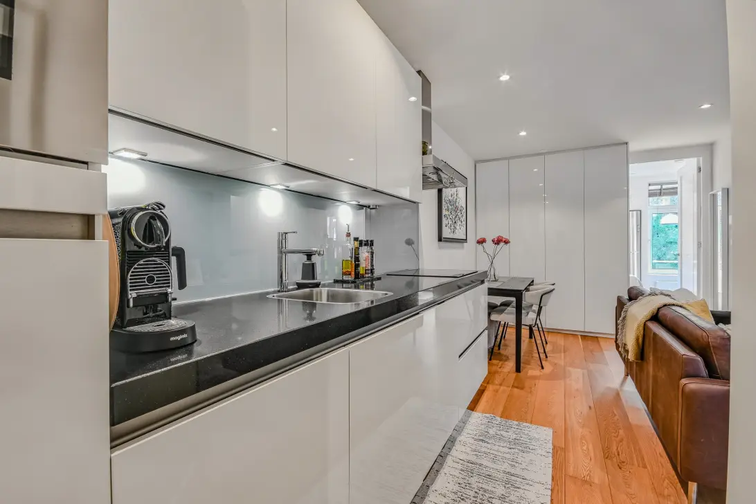 Accessed via the communal entrance and well-kept stairwell, the apartment occupies the second floor. The bright living room incorporates a sleek white high-gloss open-plan kitchen (2017) fitted with premium SMEG appliances, including a combination oven/microwave, hob, extractor, fridge/freezer, dishwasher and washer/dryer.