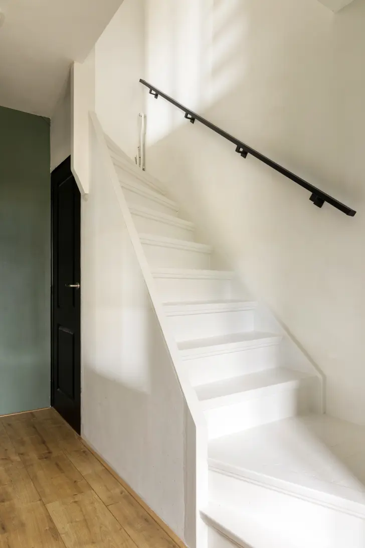 Landing, three bedrooms (one at the front and two at the rear of the house). The bathroom is equipped with a second toilet, walk-in shower, design radiator, and bathroom cabinet. The bathroom features a poured floor and cement-art walls.
