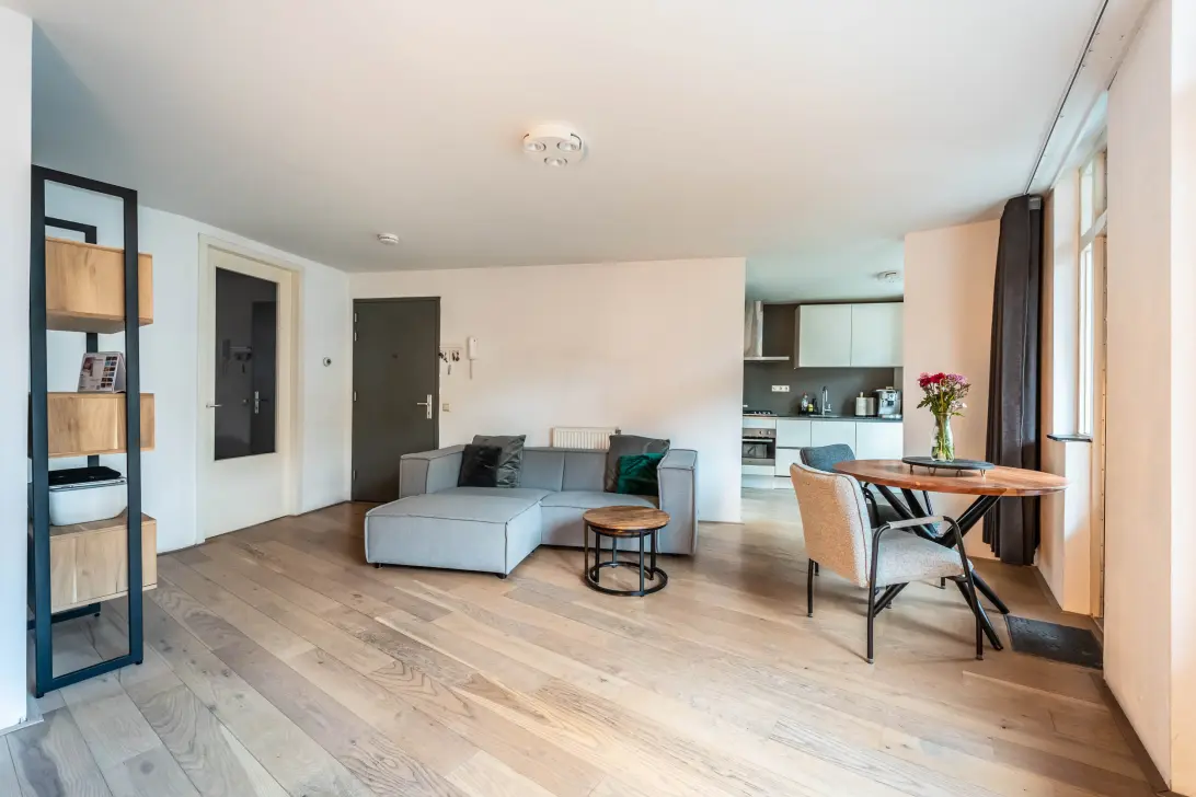 Eerste verdieping: Op de eerste verdieping bevindt zich de royale en lichte woonkamer met open keuken. Dankzij de grote raampartijen aan de achterzijde geniet deze ruimte van een prettige hoeveelheid daglicht. Er is volop plek voor een ruime zithoek, eettafel en een comfortabele werkplek. De gehele ruimte is afgewerkt met een nette houtenvloer en keurig stucwerk. In de hoek van de woonkamer is een separaat toilet gesitueerd, deze is afgewerkt in dezelfde stijl als de badkamer met fraai tegelwerk en gouden details.