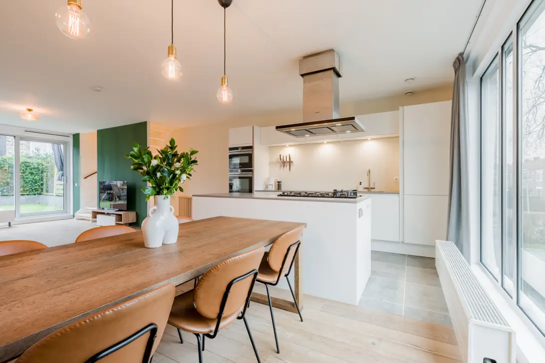 The first floor is the heart of the house: a spacious living area of no less than 52 m², with oak flooring and smooth plastered walls. Thanks to its corner location, there is plenty of natural light here. This is a wonderful place to relax with your family or friends. The living room at the rear provides access to the large, sunny roof garden through sliding doors. The modern open kitchen with kitchen island is fully equipped with plenty of cupboard space and good built-in appliances: an oven with microwave function, a (steam) oven, 5-burner gas hob, extractor hood, dishwasher, and boiling water tap, making cooking a joy!