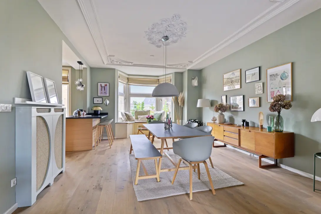 Op een geliefde locatie in Amsterdam-Zuid, midden in de charmante Stadionbuurt, bevindt zich dit uitzonderlijk stijlvolle dubbel bovenhuis van 131m² (bvo 156m²). De woning is in 2023 met oog voor detail en onder architectuur verbouwd, waarbij luxe, comfort en stijl naadloos samenkomen. Verdeeld over de derde en vierde verdieping van een karakteristiek jaren ’30 pand, vormt deze woning een smaakvolle balans tussen authentieke charme en eigentijdse elegantie. Met drie volwaardige slaapkamers, twee verfijnde badkamers, een zonnig balkon én een recent aangelegd dakterras van ruim 43m², biedt dit huis een bijzondere en rustige woonervaring in een levendige buurt. Al bij binnenkomst voel je de serene sfeer. Licht speelt de hoofdrol in het interieur, waarin zachte kleurtonen, originele ornamentenplafonds, paneeldeuren met klassiek beslag, een sfeervolle gashaard en een erker met zitje samenkomen tot een harmonieus geheel. Noemenswaardig is de op maat gemaakte boekenkast en radiatorombouw, geïntegreerd in de prachtige living. De eikenhouten vloeren verbinden de ruimtes op elegante wijze en zorgen voor een warme, uitnodigende uitstraling.