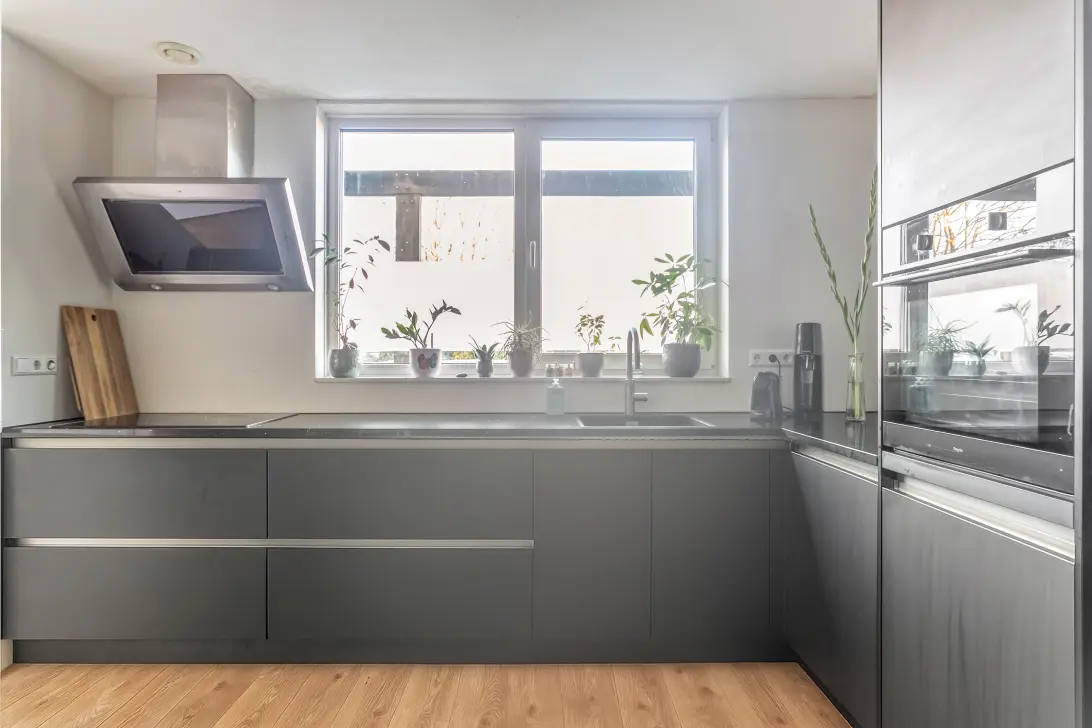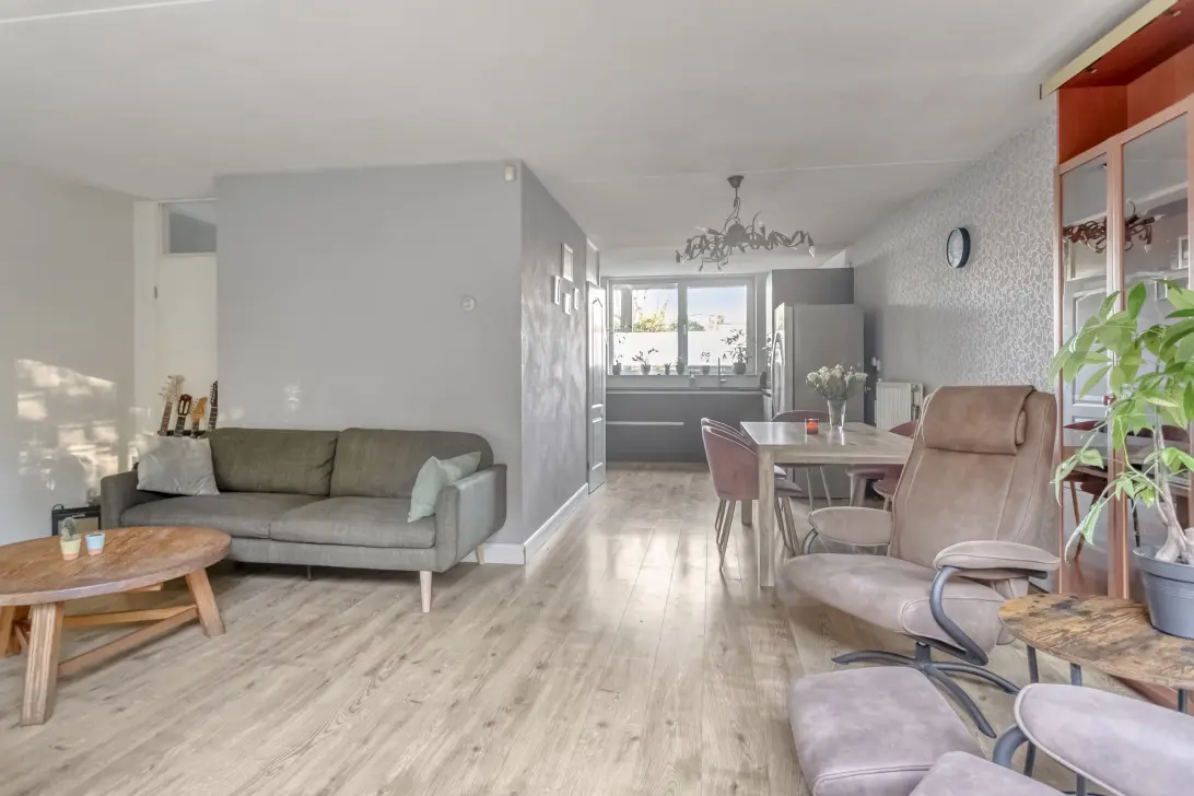 Via de verzorgde voortuin betreed je de woning en kom je binnen in de lichte hal met toegang tot het toilet en een praktische trapkast. Wanneer je doorloopt, ontvouwt de leefruimte zich als één fijne, open en speels ingedeelde verdieping. Aan de voorzijde ligt de keuken, waar dankzij de brede opstelling veel werk- en opbergruimte beschikbaar is. Vanuit de keuken loopt de ruimte vloeiend over in een royale eetkamer, ideaal voor lange diners en gezellige avonden.