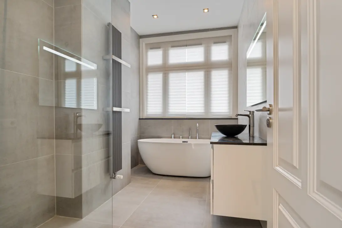 De luxe badkamer is uitgevoerd in moderne grijstinten en vormt een oase van rust. Je vindt hier een vrijstaand bad, ruime inloopdouche met regendouche, elegant wastafelmeubel met natuurstenen waskom, verwarmde spiegel en stijlvolle verlichting. Alles is tot in detail afgewerkt met hoogwaardige materialen en de badkamer beschikt over elektrische vloerverwarming.