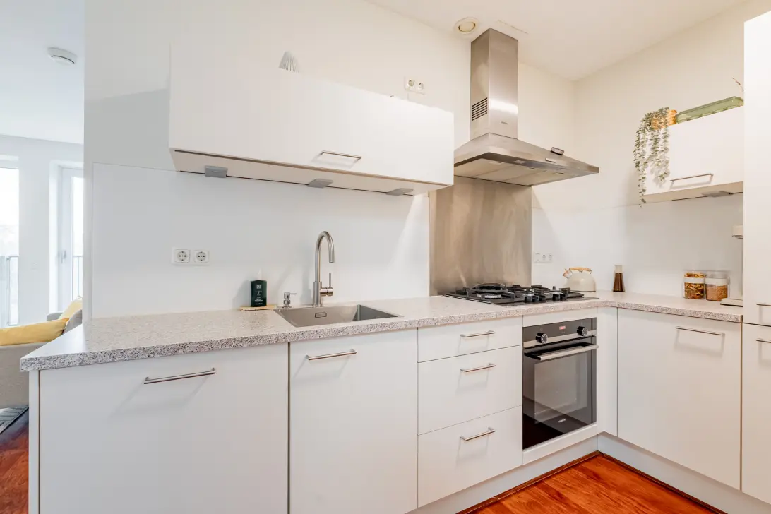 De woonkamer is prettig van formaat en dankzij de grote raampartijen heerlijk licht. De vernieuwde (2021) open keuken is praktisch opgesteld en voorzien van diverse hoogwaardige Siemens inbouwapparatuur, waaronder: een 4-pits gaskookplaat met wokbrander, afzuigkap, vaatwasser, koelkast met vriesvak en een combimagnetron-oven. De woonkamer en de kleinste slaapkamer geven toegang tot het balkon.