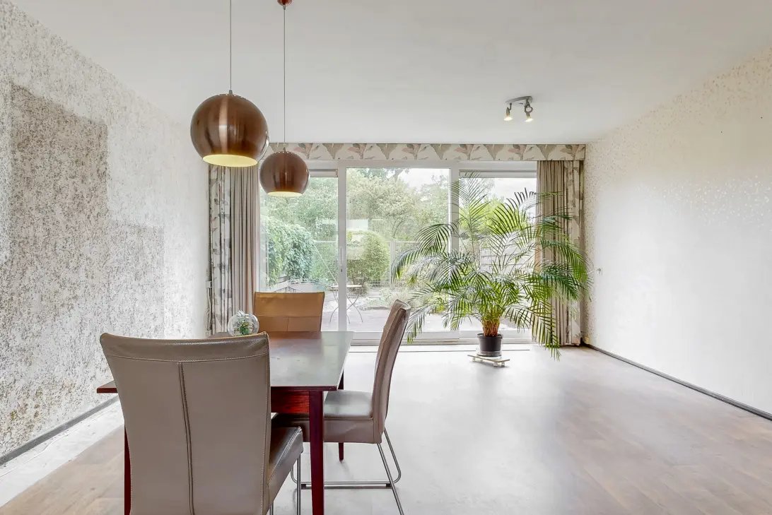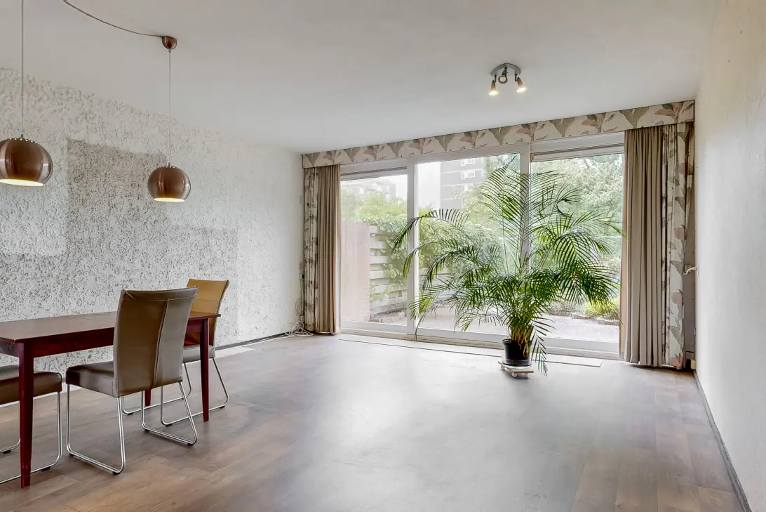De lichte woonkamer is voorzien van een vinylvloer met houtlook en heeft een schuifpui naar de achtertuin.