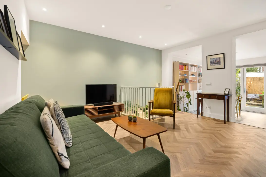 The living room has a playful open connection to the eat-in kitchen at the rear of the apartment, making it a wonderful space to cook with family or friends and enjoy long dinners together. French doors provide access to the well-kept east-facing garden. On summer days, this is a perfect place to relax and enjoy the sun in a peaceful, green setting.