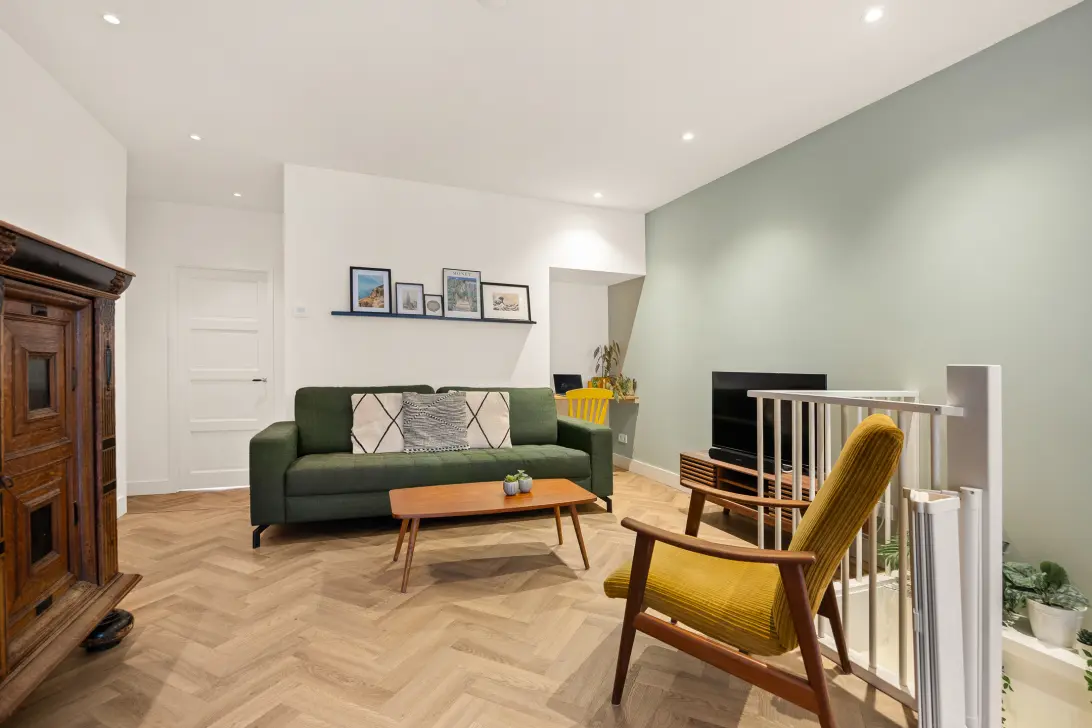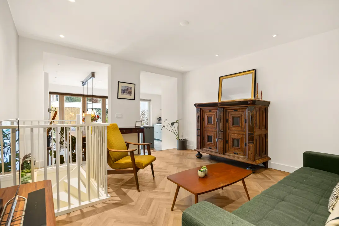 This property truly falls into the “unpack your boxes and start living” category. In 2021, the apartment was completely renovated internally and finished to a high standard. The renovation included, among other things, a 4-metre-deep extension, a new luxury kitchen with island, and a beautiful bathroom with walk-in shower and bathtub. A stylish PVC floor with underfloor heating was installed, along with a new central heating boiler, renewed electrical installation and fuse box. Walls and ceilings have been plastered and painted, and the rear façade features wooden window frames with HR++ double glazing.
