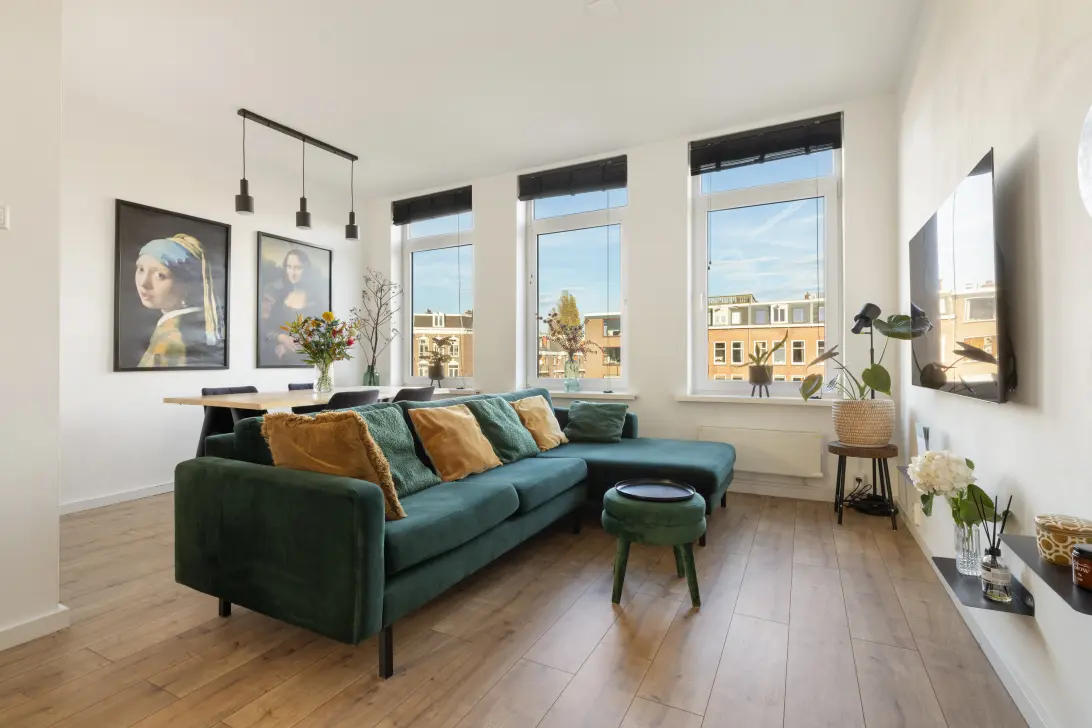 At the front, you will find the bright living room with three large tilt-and-turn windows overlooking the lively Beukenplein. This space enjoys abundant natural light throughout the day and offers an open view. Centrally located in the apartment is the bathroom, equipped with a walk-in shower, washbasin, and toilet. At the rear is the spacious bedroom with access to the sunny southwest-facing balcony – a wonderful place to relax with views of the green inner gardens. The kitchen, also at the rear, is fitted with various built-in appliances and provides additional access to the balcony.