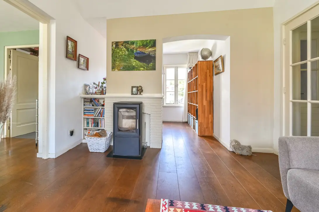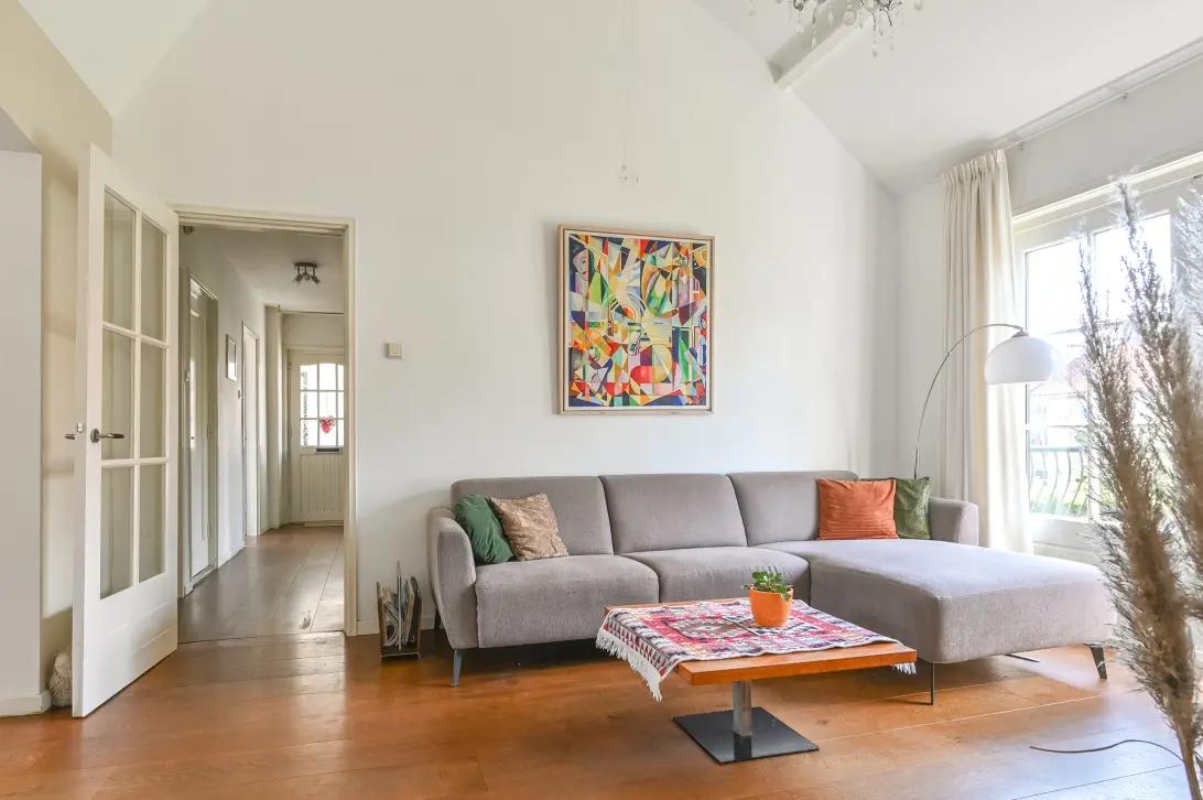 Eerste verdieping: entree; ruime hal; uitgebreide elektra meterkast; toilet; prachtige woonkamer met hoog plafond tot in de nok, houtkachel en openslaande deuren naar balkon; eetkamer met openslaande deuren naar balkon; woonkeuken met gasfornuis, oven, afzuigkap en vaatwasser, toegang tot balkon. Slaapkamer aan de achterzijde met balkon; slaapkamer aan de voorzijde met vaste kasten; badkamer met inloopdouche, wastafelmeubel en designradiator. Aparte wasruimte. Hal, woonkamer en eetkamer zijn voorzien van lamel-eikenhouten vloeren.