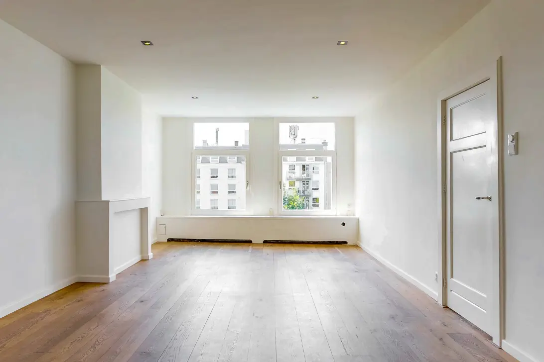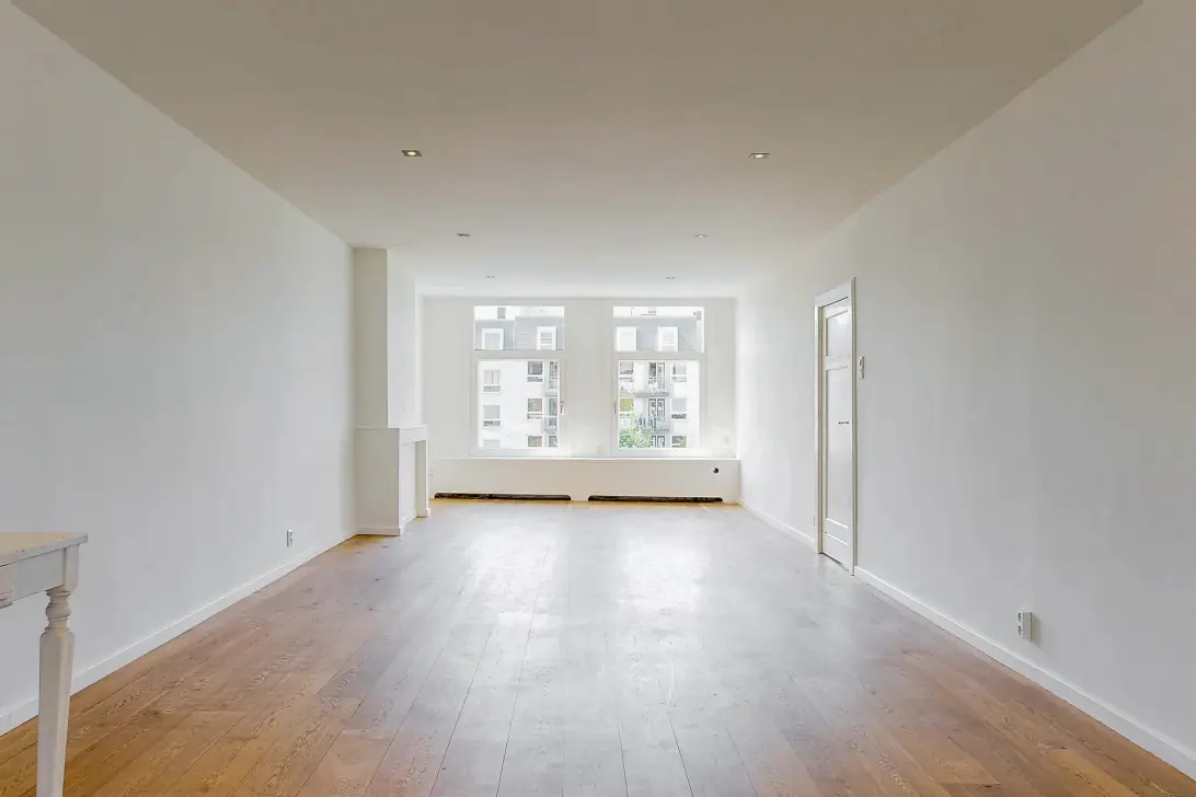 Zeer ruime woonkamer met open keuken met eiland en toegang tot het balkon aan de achterzijde. Aan de voorzijde grote ramen die een prachtig uitzicht geven over de Bilderdijkgracht.