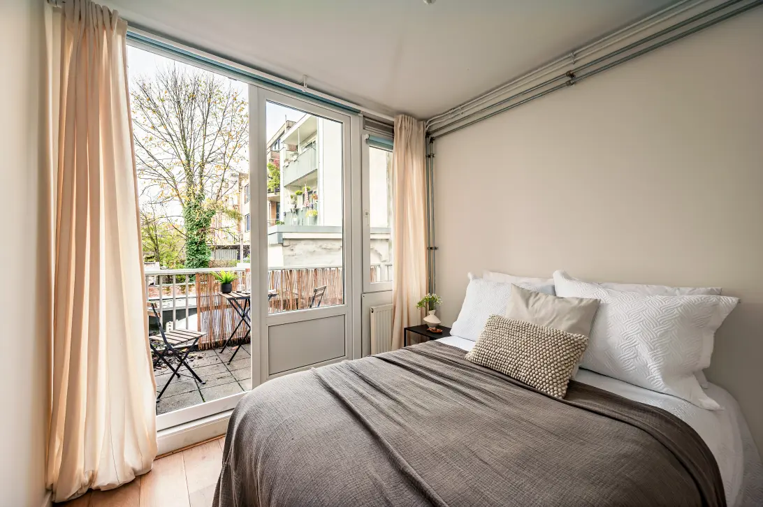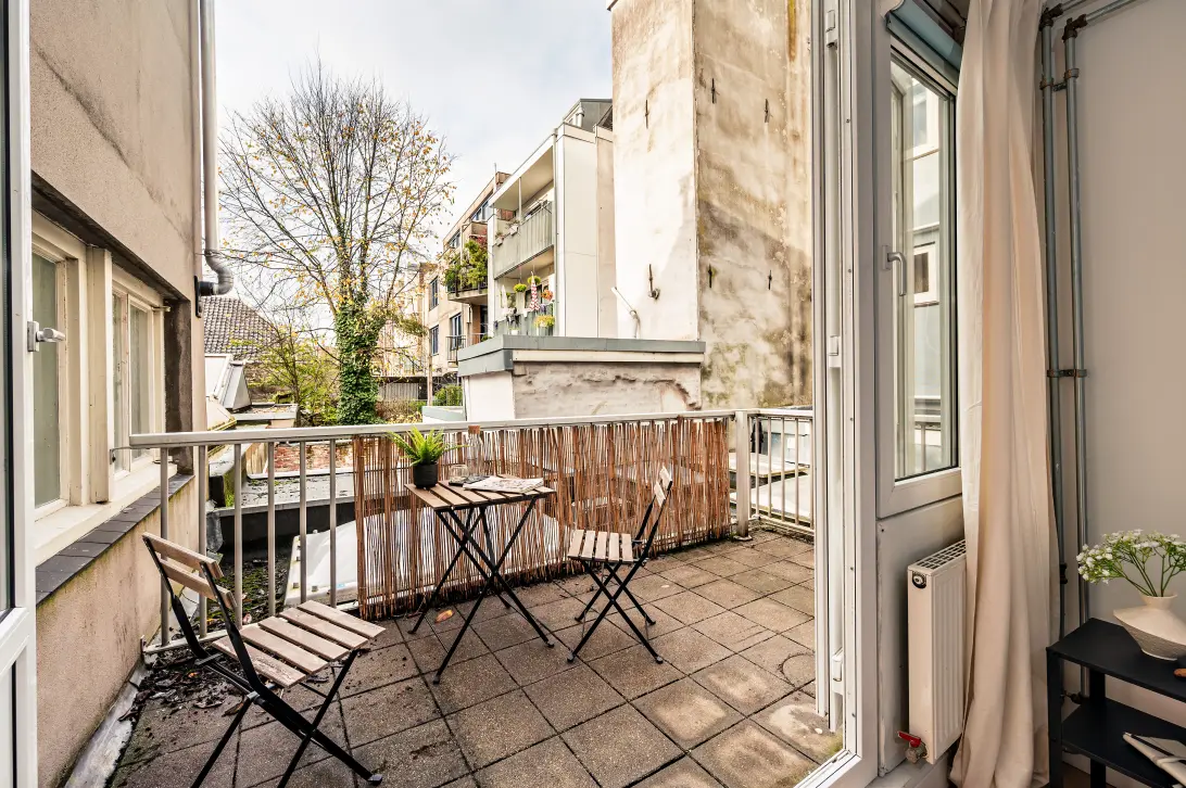 Aan de achterzijde ligt de slaapkamer, een rustige en comfortabele ruimte met direct toegang tot het ruime balkon van ongeveer 7 m². Dankzij de ligging op het noordwesten kun je hier vooral in de middag en avond genieten van de zon, een fijne buitenruimte midden in de stad. In de slaapkamer is een wastafel aanwezig en vanuit deze kamer loop je door naar de badkamer die is ingericht met een inloopdouche en een toilet.