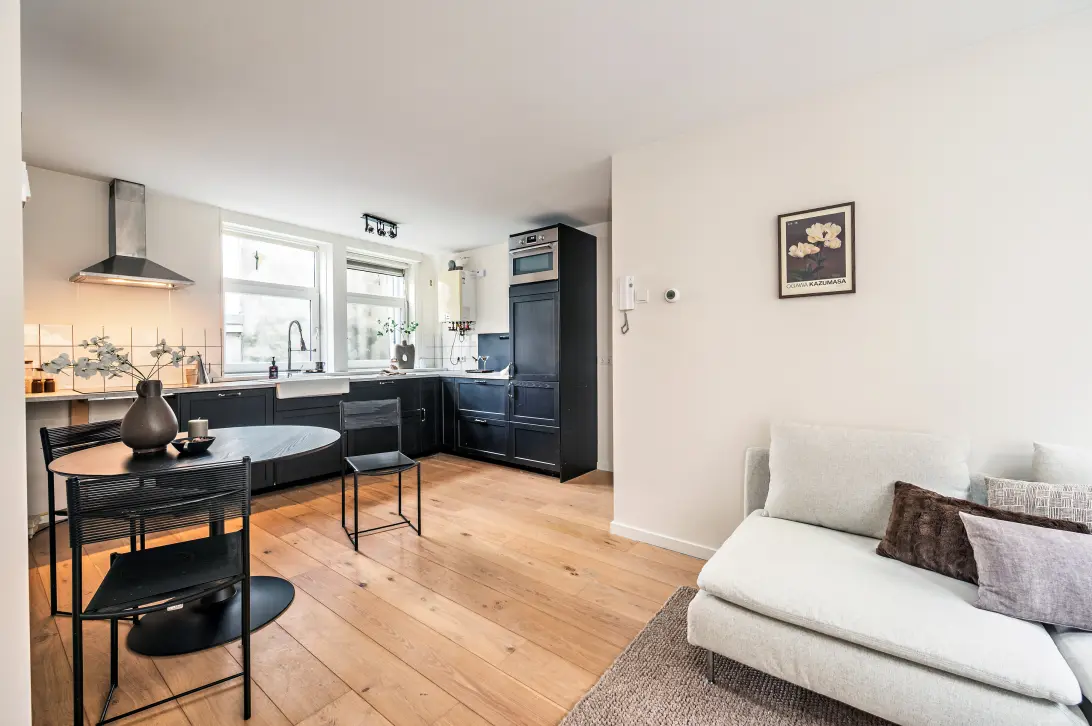 Via het gemeenschappelijke trappenhuis bereik je de entree op de eerste verdieping. Je komt binnen in de lichte woonkamer met open keuken, een prettige ruimte met ramen aan zowel de voor- als de achterzijde, waardoor er de hele dag veel daglicht binnenvalt. De woonkamer voelt ruim aan en biedt genoeg mogelijkheden om de ruimte naar eigen smaak in te delen. De open keuken is compleet uitgerust met een koelkast, vriezer, inductiekookplaat, afzuigkap, oven en vaatwasser. In de woonkamer bevindt zich daarnaast een inloopkast, een handige plek om spullen overzichtelijk en uit het zicht op te bergen.