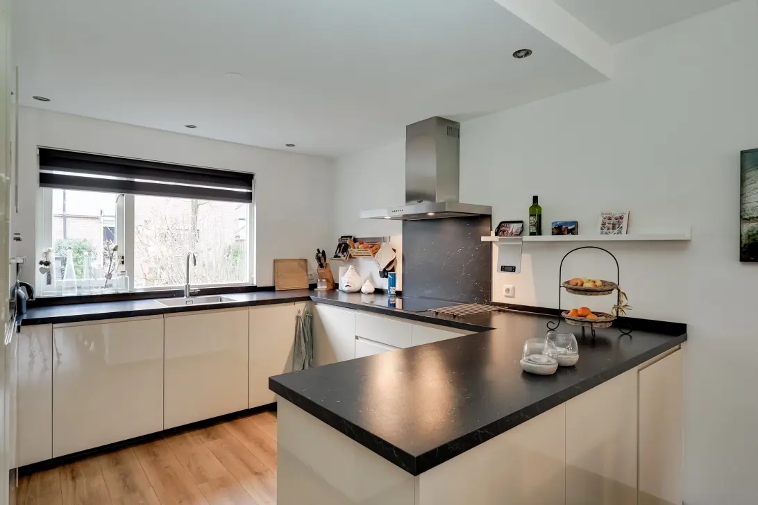 Aan de voorzijde van de woning bevindt zich de nette en moderne keuken, met uitzicht over de straat. De keuken is voorzien van diverse inbouwapparatuur, waaronder een inductiekookplaat, afzuigkap, vaatwasser, koel-vriescombinatie en magnetron.