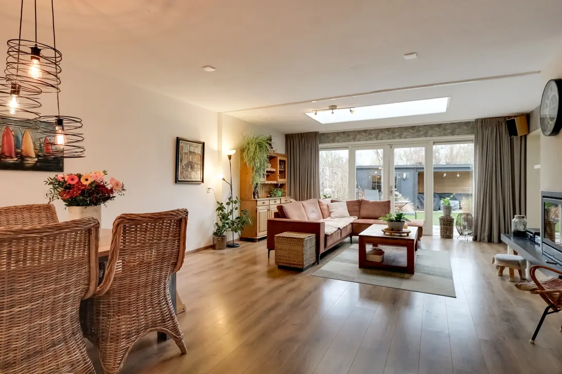 De zij-entree biedt toegang tot de hal met toiletruimte, meterkast en trapopgang. Vanuit de hal bereikt u de royale woonkamer, die strak afgewerkt is met gestuukte wanden en plafond. De aanbouw is voorzien van een lichtstraat voor extra natuurlijk daglicht. De haard zorgt voor extra warmte en sfeer in de woonkamer.