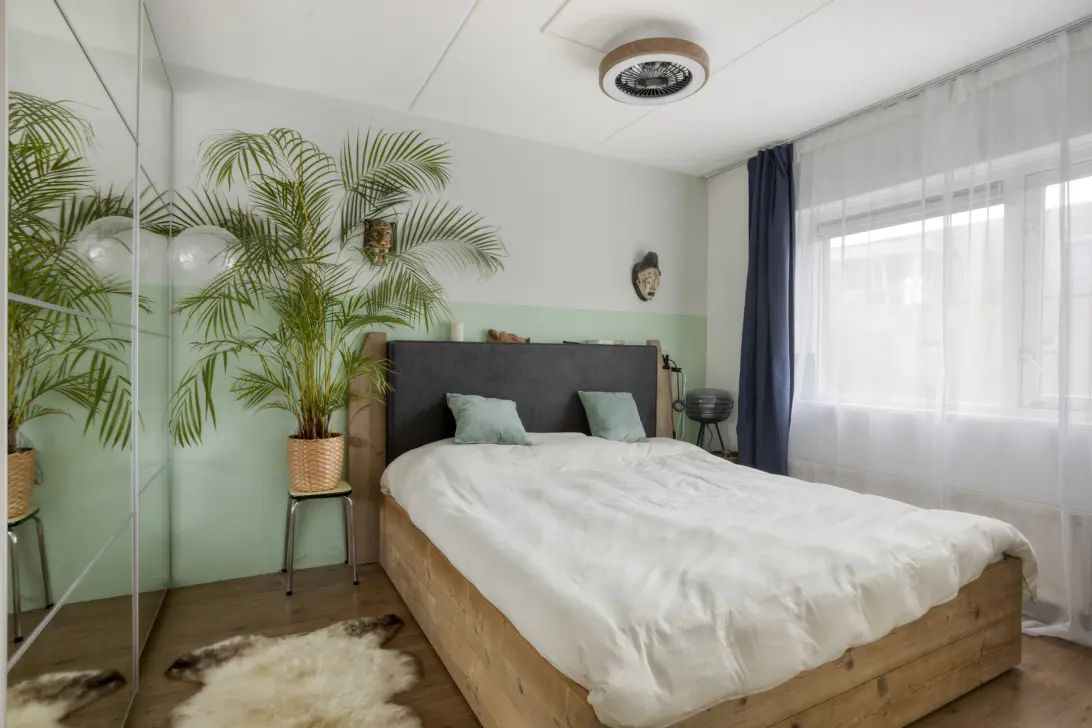 Op de zolderverdieping vind je een extra slaapkamer die je helemaal naar eigen smaak kunt inrichten. Dankzij de nieuwe, extra geïsoleerde dakramen valt er veel zonlicht binnen. Door de rolgordijnen is de zolderkamer goed donker te maken. Ook vind je hier een ruim balkon op het zuiden, ideaal voor de vroege voorjaarszon. Hier geniet je op warme dagen van een gezellige loungeplek in de buitenlucht.