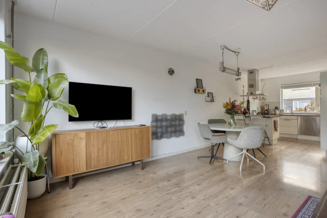 Vanaf de ruime entree stap je een uitnodigende woonkamer binnen. Dankzij de grote ramen stroomt er veel natuurlijk licht binnen en de lichte afwerking in combinatie met vloerverwarming zorgt voor een warme, gezellige sfeer. Door de ramen zie je de groene tuin en is er een vrije zichtlijn die voor veel privacy zorgt. De woning heeft een keurige laminaat vloer en lichte wanden. Hier heb jij meteen ook een perfecte basis om je eigen persoonlijke stempel te drukken.