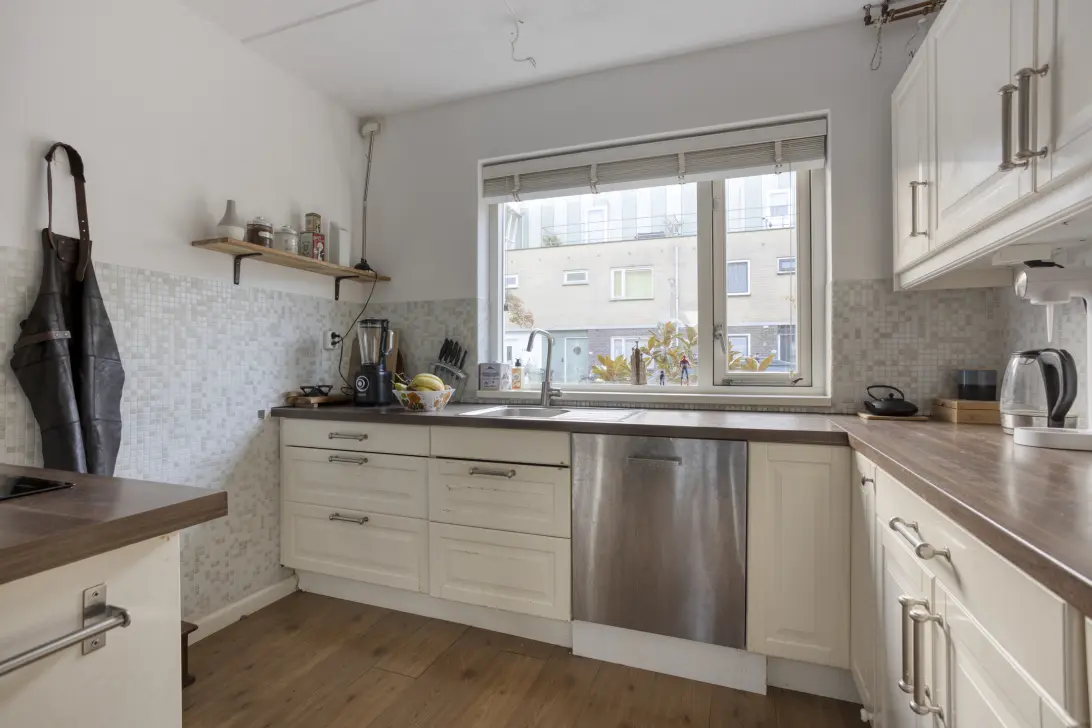Direct grenzend aan de woonkamer vind je een moderne open keuken in een praktische L-indeling met kookeiland. De keuken is voorzien van alle benodigde apparatuur zoals een inductiekookplaat, oven, grill en vaatwasser. Dit zorgt ervoor dat je volop kunt genieten van het samen koken en dineren met vrienden en familie. Terwijl je kookt neemt je bezoek alvast plaats aan de bar om lekker bij te kunnen kletsen.
