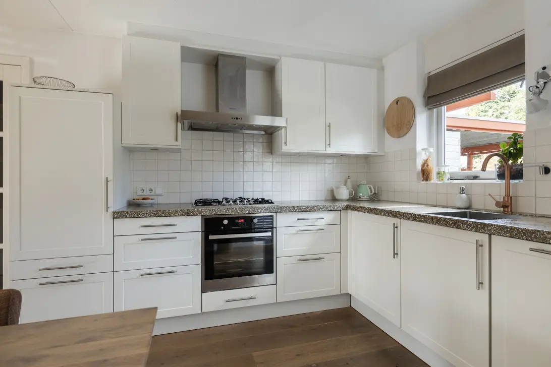 Aan de voorzijde van de woning bevindt zich de ruime open woonkeuken. De keuken is praktisch ingedeeld en voorzien van diverse inbouwapparatuur, waaronder een koelkast, grote oven, 5-pits gasfornuis en vaatwasser, plus voldoende kastruimte. Een fijne plek om te koken terwijl je in contact blijft met je gasten aan de eettafel. De keuken is uitgevoerd in wit met een lichtgekleurd composiet werkblad.