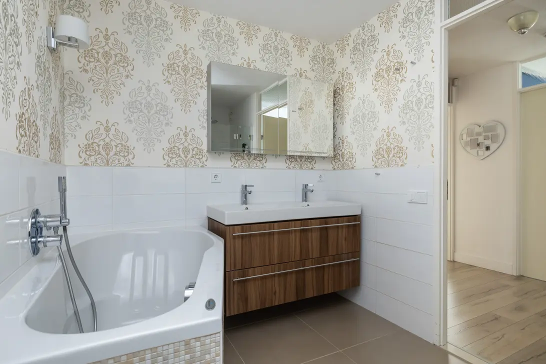De verdieping is afgewerkt in lichte, moderne kleuren met een warme laminaatvloer. De badkamer is voorzien van een ligbad, aparte douche, dubbele wastafel en een tweede toilet. De ruimte is netjes betegeld en beschikt over vloerverwarming voor extra comfort.