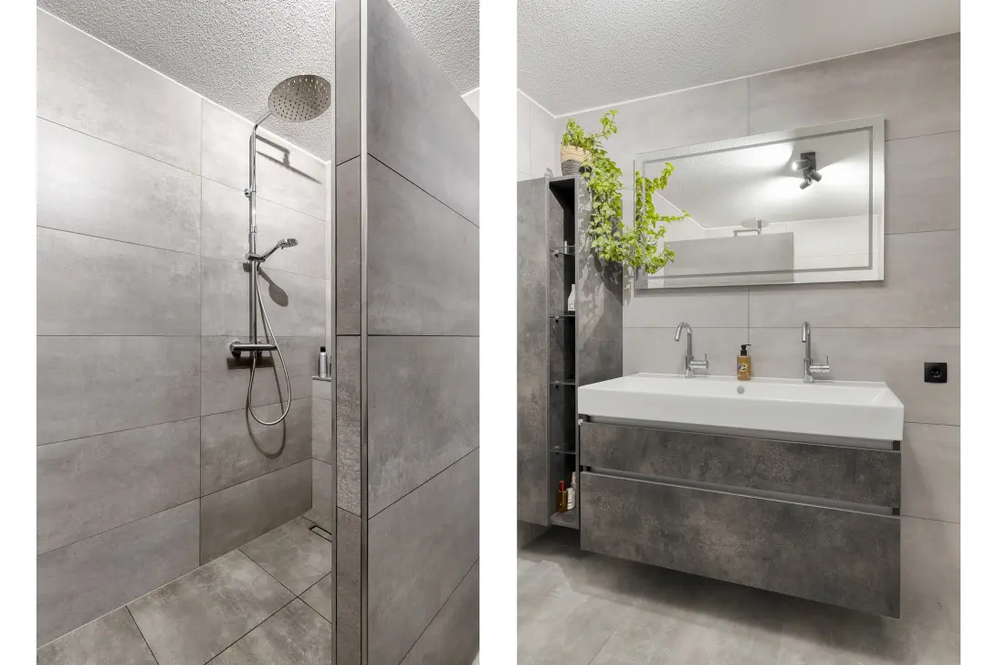 Grote wand- en vloertegels in een mooie, grijze kleur bepalen de sfeer in de badkamer. Hier heb je de beschikking over een grote inloopdouche, een tweepersoons wastafelmeubel met twee lades, een spiegel met verlichting en een hoge kast. De toiletruimte, met een wandcloset en fonteintje, is uitgevoerd in dezelfde stijl.