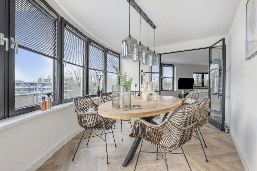 De fraaie vorm van het gebouw komt goed tot uiting in de royale woonkamer, die grenst aan de keuken en de loggia. De loggia is thans in gebruik als eetkamer, maar met een andere indeling van de woonkamer kan deze ruimte zijn oorspronkelijke functie weer krijgen. Door de grote ramen valt veel licht naar binnen en het uitzicht vanaf de vijfde verdieping is perfect. Niet te laag en niet te hoog.