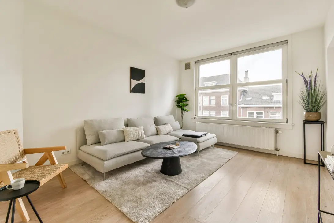 De L-vormige woonkamer bevindt zich aan de voorzijde en kijkt uit over de rustige straat, met veel natuurlijke lichtinval.