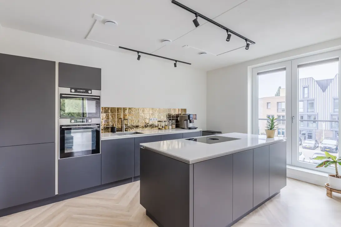 Het hart van de woning is zonder twijfel de royale lichte woonkamer met openkeuken. De keuken met kookeiland is volledig uitgerust met inbouwapparatuur waaronder een Bora inductiekookplaat met geïntegreerde afzuiging, vaatwasser, Quooker, oven, combimagnetron, koelkast en vriezer. Alles wat je nodig hebt om uitgebreid te koken en gezellig te tafelen met vrienden en familie. Daarnaast biedt de woonkamer volop ruimte voor een comfortabele zithoek en gezellige eethoek. Het balkon is bereikbaar vanuit de woonkamer middels een schuifpui en doordat het appartement zich op de punt van het gebouw bevindt biedt het balkon vrij uitzicht in beide richtingen.