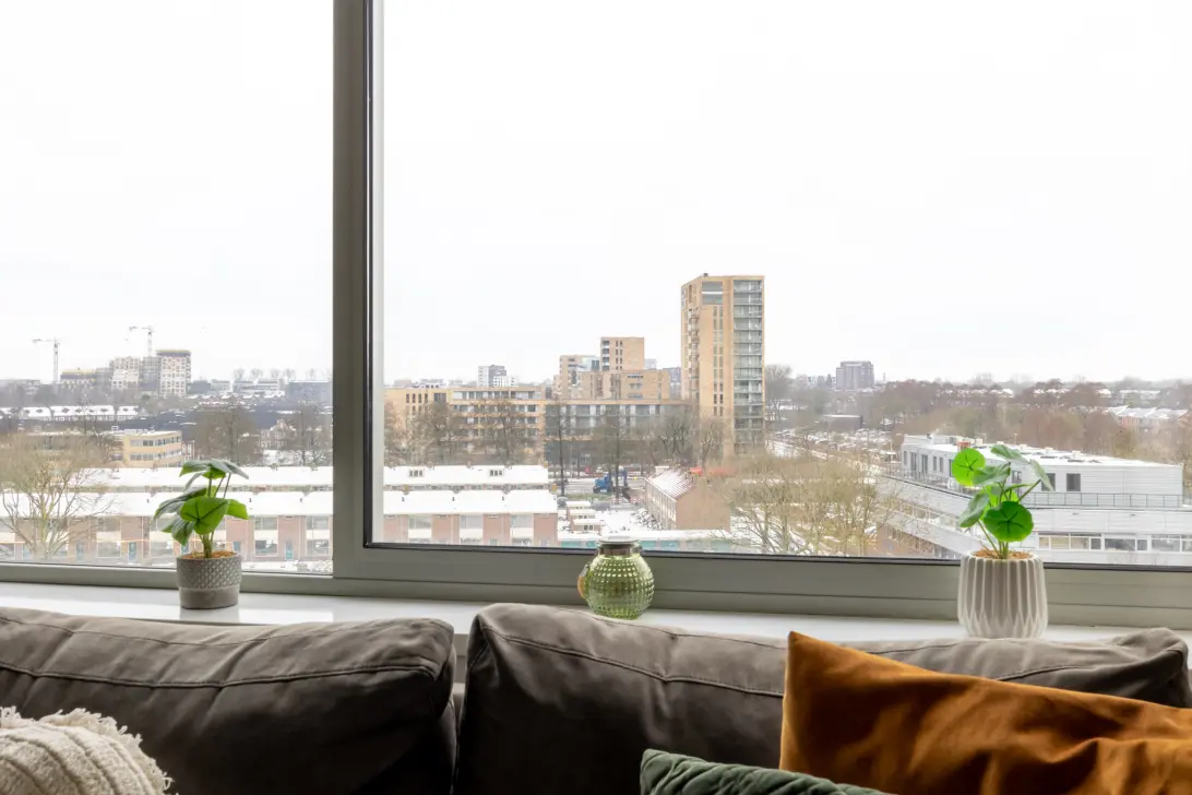 De woonkamer is slim ingedeeld, waardoor je hier moeiteloos plek hebt voor een eettafel én een comfortabele zithoek. De laminaatvloer geeft een nette uitstraling en dankzij de grote ramen geniet je van veel daglicht. Het uitzicht over de stad is bovendien een echte bonus, hier raak je niet snel op uitgekeken.