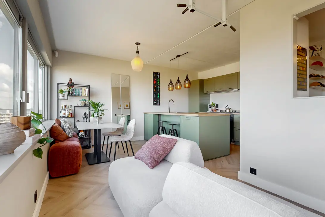 De woonkamer vormt het hart van het appartement en biedt volop ruimte voor een gezellige zithoek en een eettafel. De luxe open keuken sluit hier naadloos op aan en is modern uitgevoerd met een strakke afwerking en een praktische indeling. Een fijne plek om uitgebreid te koken of gezellig te tafelen met vrienden en familie.