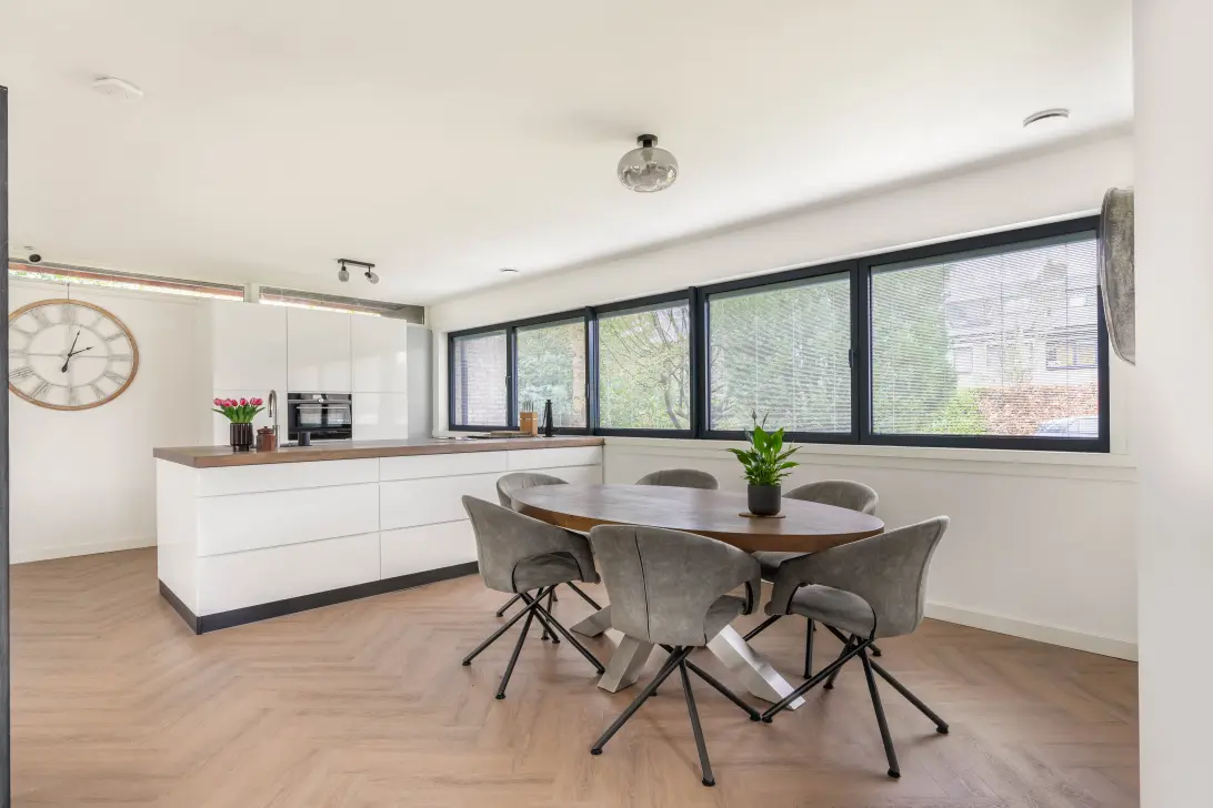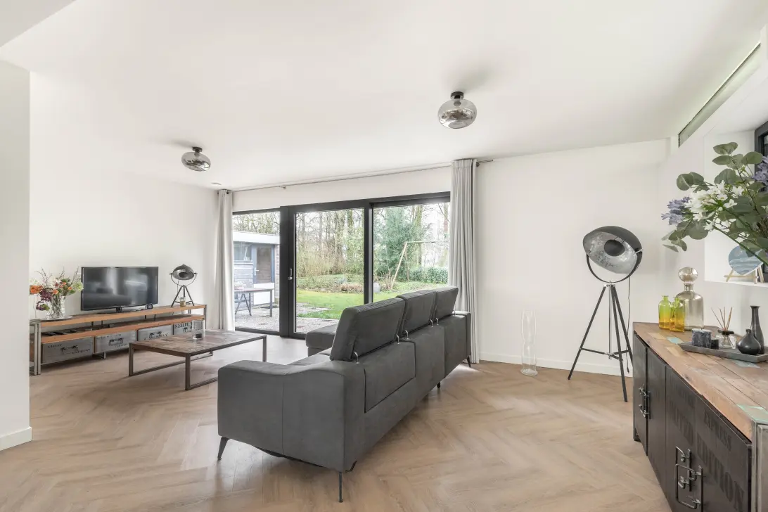 Ruime oprit met voldoende ruimte voor twee auto’s en een groene voortuin. De garage is zeer ruim en biedt veel opbergruimte of plaats voor een auto. Tevens is hier de technische ruimte gecreëerd met de opstelplaats van de warmtepomp en de boiler. In de garage bevinden zich ook de omvormer van de 36 zonnepanelen en de aansluitingen voor de wasmachine en droger. Entree van de woning. Direct rechts bevinden zich het toilet met fonteintje en de garderoberuimte (ook hier zijn aansluitingen gemaakt voor de wasmachine en droger). Tevens is hier de opstelplaats van de WTW-unit, die netjes is weggewerkt achter een deur. De woonkamer is voorzien van vloerverwarming en een in visgraat gelegde pvc-vloer. De grote raampartijen aan de voorzijde van de woning vallen direct op; hierdoor is er veel natuurlijk daglicht in de woning. De moderne open keuken beschikt over een kookschiereiland en is voorzien van diverse Siemens inbouwapparatuur: een oven, warmhoudlade, Quooker, keramische kookplaat met geïntegreerde afzuiging, vaatwasser, koelkast en vriezer. De keuken heeft een mooie witte afwerking met een houtlook werkblad en biedt voldoende opbergruimte in de kasten en lades. Aan de achterzijde bevindt zich een mooie kunststof schuifpui die toegang biedt tot de achtertuin.