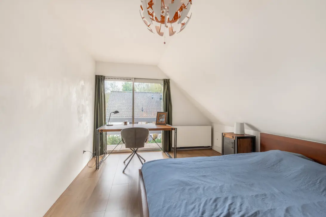 Via de open trap bereikt u de eerste verdieping. Direct rechts bevindt zich de kantoorruimte met een glazen pui als afscheiding en een schuifpui naar het eerste balkon. Op deze verdieping zijn daarnaast nog drie slaapkamers aanwezig, alle van goed formaat. De slaapkamer aan de voorzijde van de woning biedt toegang tot de vliering. De badkamer is ruim en voorzien van een toilet, douche en wastafelmeubel met spiegelkast.