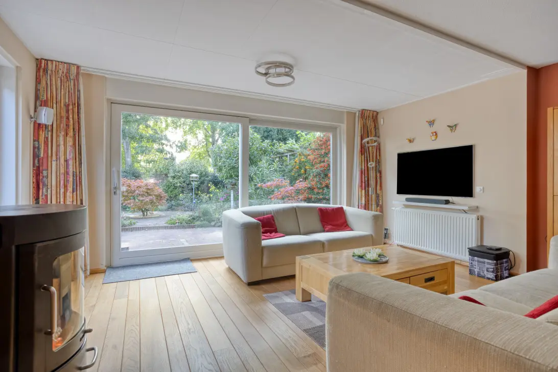 Aan de achterzijde is de ruime woonkamer gesitueerd. De woonkamer is maar liefst 2,5 meter uitgebouwd, heeft een mooie sfeervolle houtkachel, veel lichtinval door de grote houten schuifpui en het zijraam en heeft voldoende ruimte voor het plaatsen van een mooie zit-/ en eethoek. Fraaie massief eikenhout vloer. Vanuit de woonkamer kijk je uit op de verzorgde zonnige achtertuin(Z-W) en kom je heerlijk tot rust door het groen en de fijne vrije ligging aan de achterzijde.