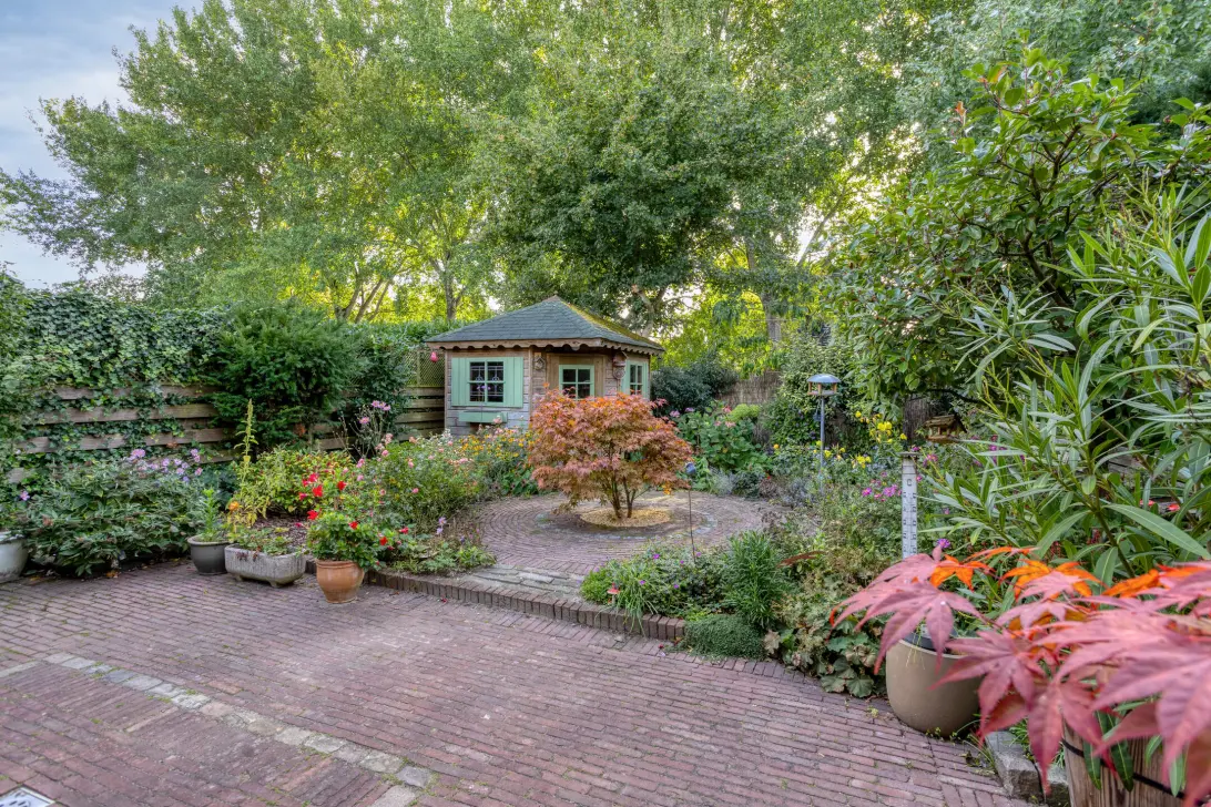De achtertuin is gelegen op het zuidwesten en is verzorgd en groen aangelegd. De tuin is heerlijk zonnig en er is een groot zonnescherm tegen de achtergevel geplaatst. Er zijn diverse borders met verschillende bomen en planten. Hier kunt u genieten van alle rust en het groen. De tuin is verder voorzien van gebakken waalstenen en 2 afwateringen (aangesloten op de riolering). Achterin is er een vrijstaande houten berging geplaatst. Deze is voorzien van elektra en het dakbedekking is 5/6 jaar geleden nog vernieuwd. Aan de zijkant vindt u de garage met elektrische deur, waar u voldoende ruimte heeft voor het parkeren van uw auto. Er is een spoelbak en wateraansluiting voor de tuin. De eigenaren hebben in de hoge kap van de garage een stevige vliering gebouwd, ideaal voor extra bergruimte. Hier vindt u de omvormer voor de 11 zonnepanelen (2022).