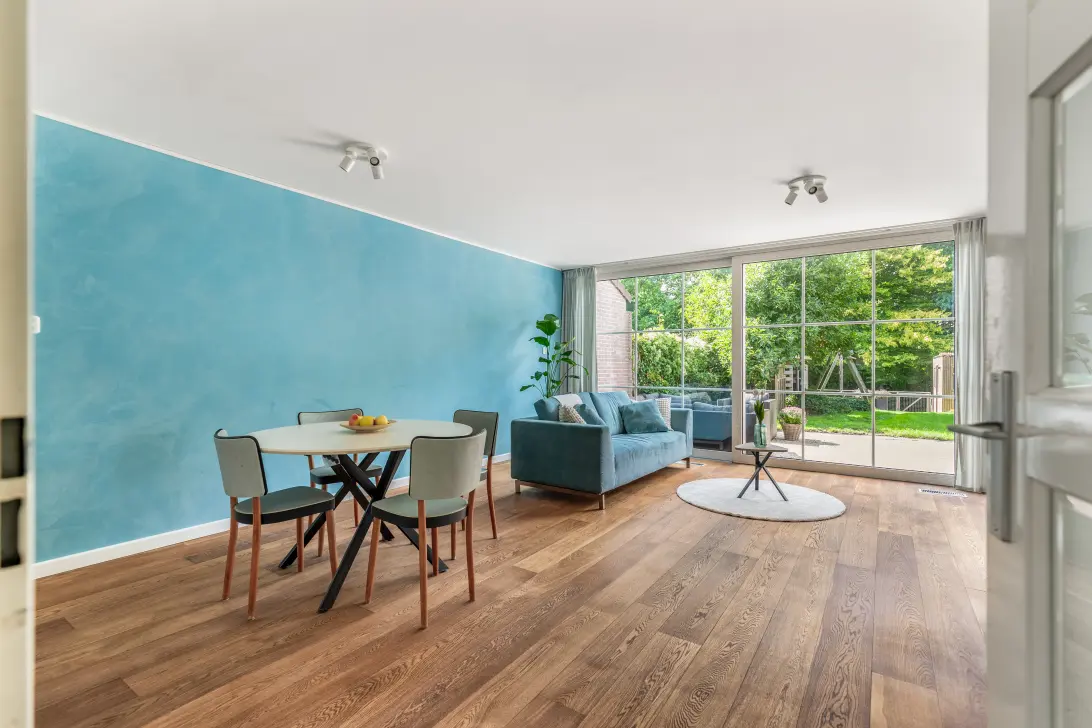 Bij binnenkomst valt direct op hoe licht en overzichtelijk de woning is. Aan de voorzijde bevindt zich de verzorgde keuken, voorzien van inbouwapparatuur en zijdeur richting de oprit. De woonkamer strekt zich uit over de volledige breedte van de woning en krijgt dankzij de brede raampartij volop daglicht. Via de schuifdeur staan binnen en buiten in directe verbinding met elkaar.