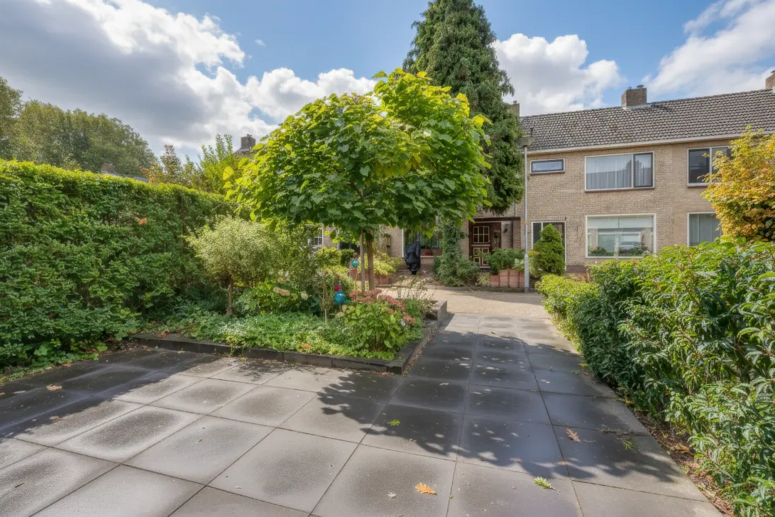 De achtertuin ligt op het noorden en beschikt over een grote berging(ca. 12m²) en een handige achterom. Het is een fijne buitenruimte om te ontspannen of een gezellig zitje te creëren.