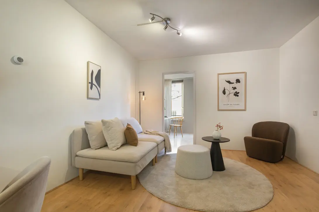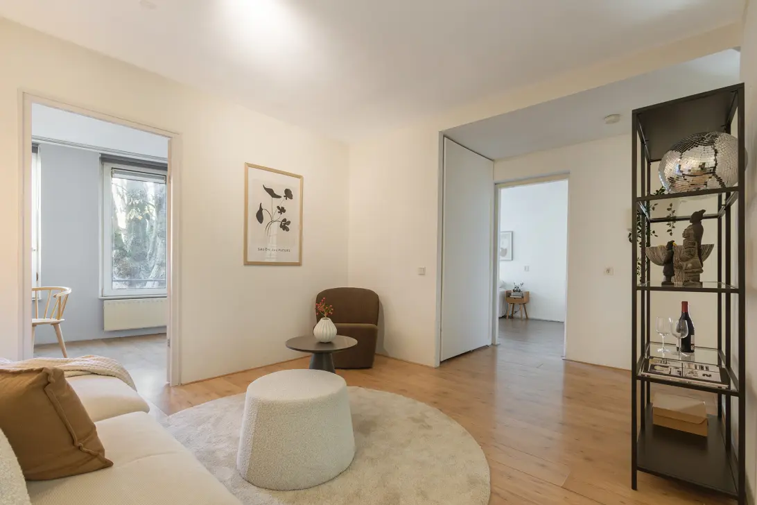 The living room is located in the centre of the property and overlooks the balcony and the quiet courtyard through the kitchen. The space is large enough for both a comfortable seating area and a dining table. The layout is practical: all rooms are easily accessible from the central hall, making the entire home feel open and spacious.