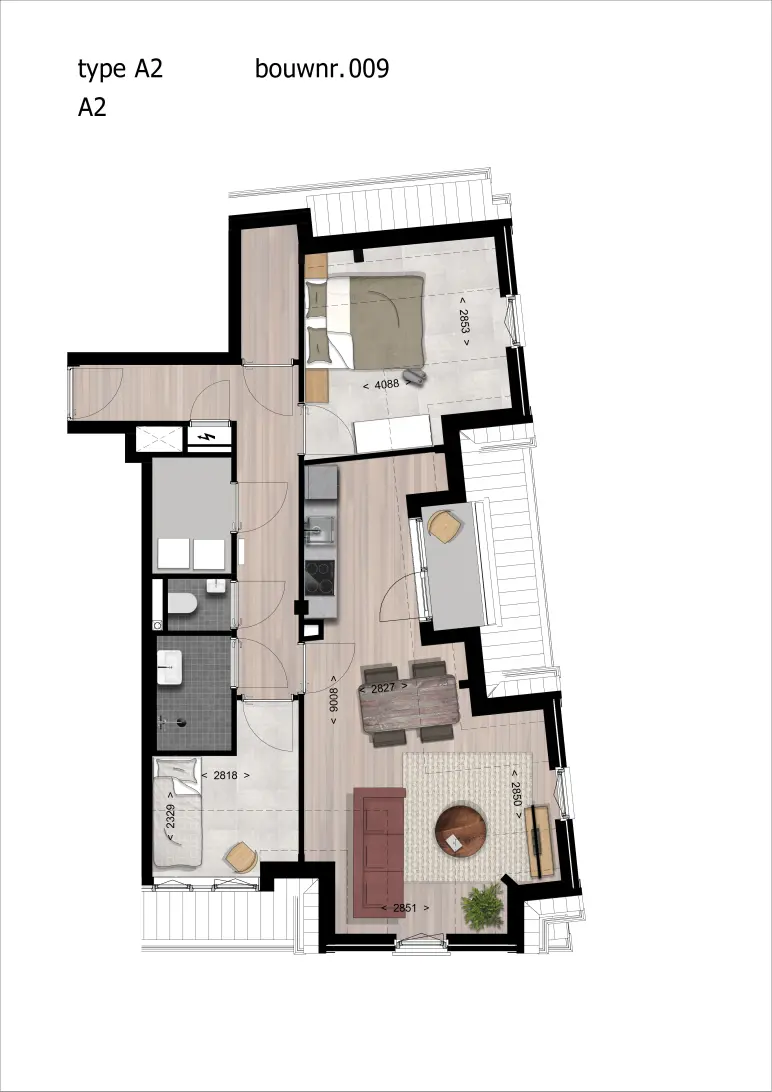 Appartement A2 beschikt over een grote living, twee ruime slaapkamers en een mooi balkon met vrij uitzicht. De moderne badkamer is voorzien van een wastafel en douche, een apart toilet bevindt zich in de hal. Daarnaast is er een grote bergruimte voor je wasmachine en droger en een technische ruimte. Op de begane grond vind je de gezamenlijke fietsenstalling voor je (elektrische) fiets(en) of scooter, bereikbaar via een deur vanuit het trappenhuis.