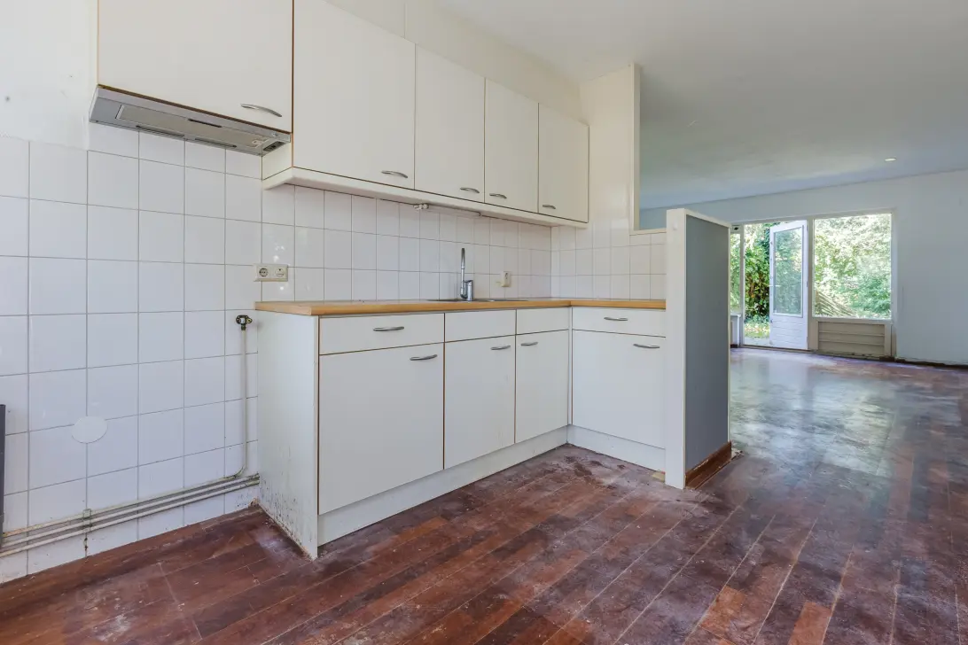 Bij binnenkomst in de woning tref je een hal met meterkast, een toilet en de trap naar de eerste verdieping. Vanuit de hal loop je door naar de lichte woonkamer, die is voorzien van grote raampartijen en een deur naar de tuin. De open keuken is eenvoudig en biedt de basisvoorzieningen, waardoor je deze volledig naar eigen wens kunt inrichten.