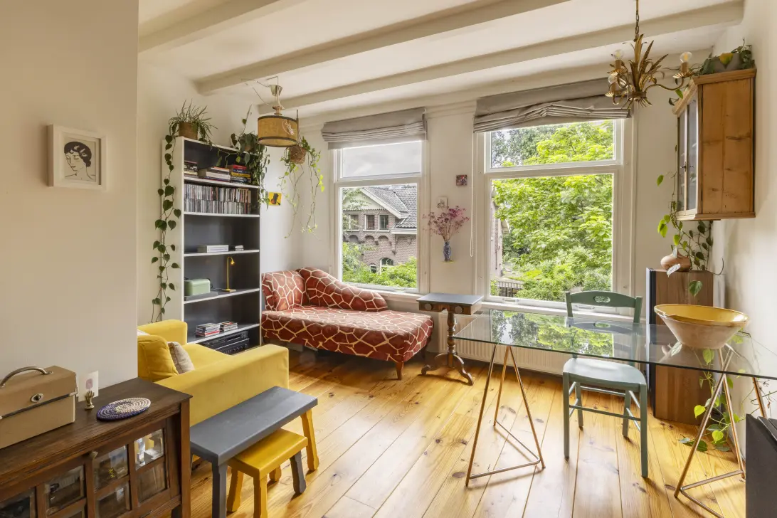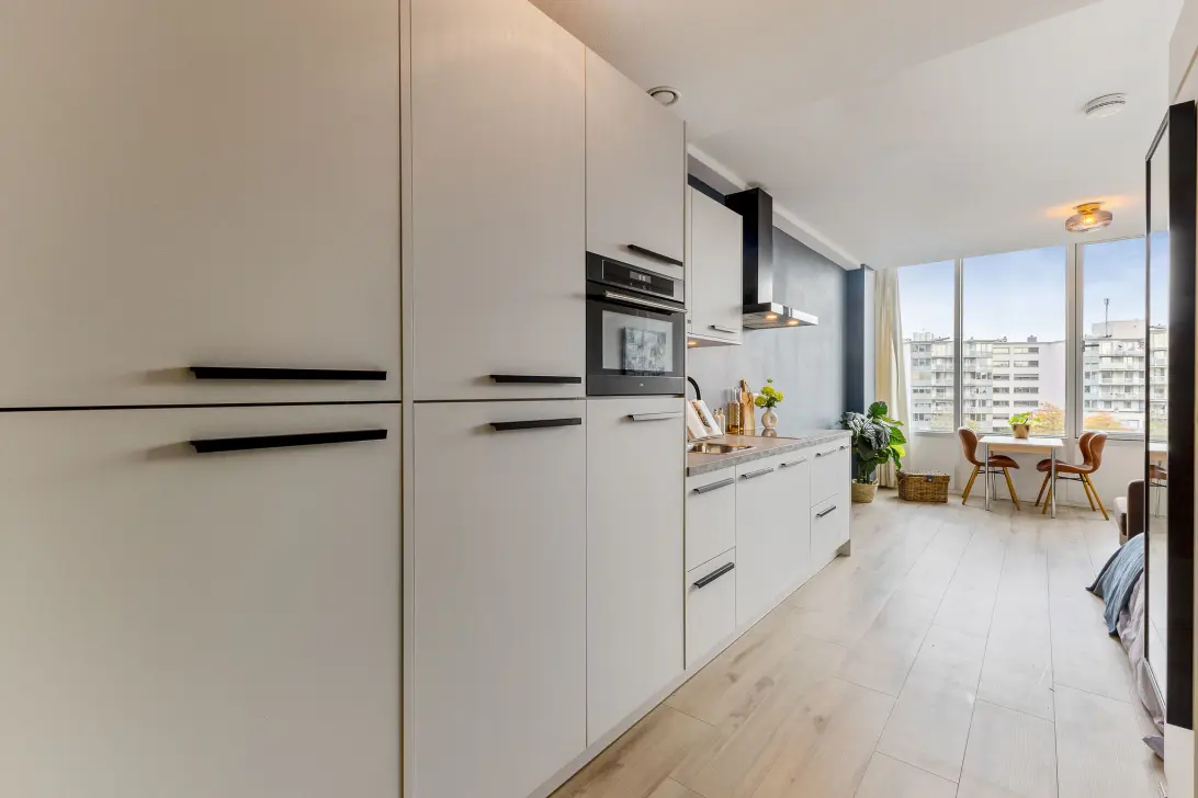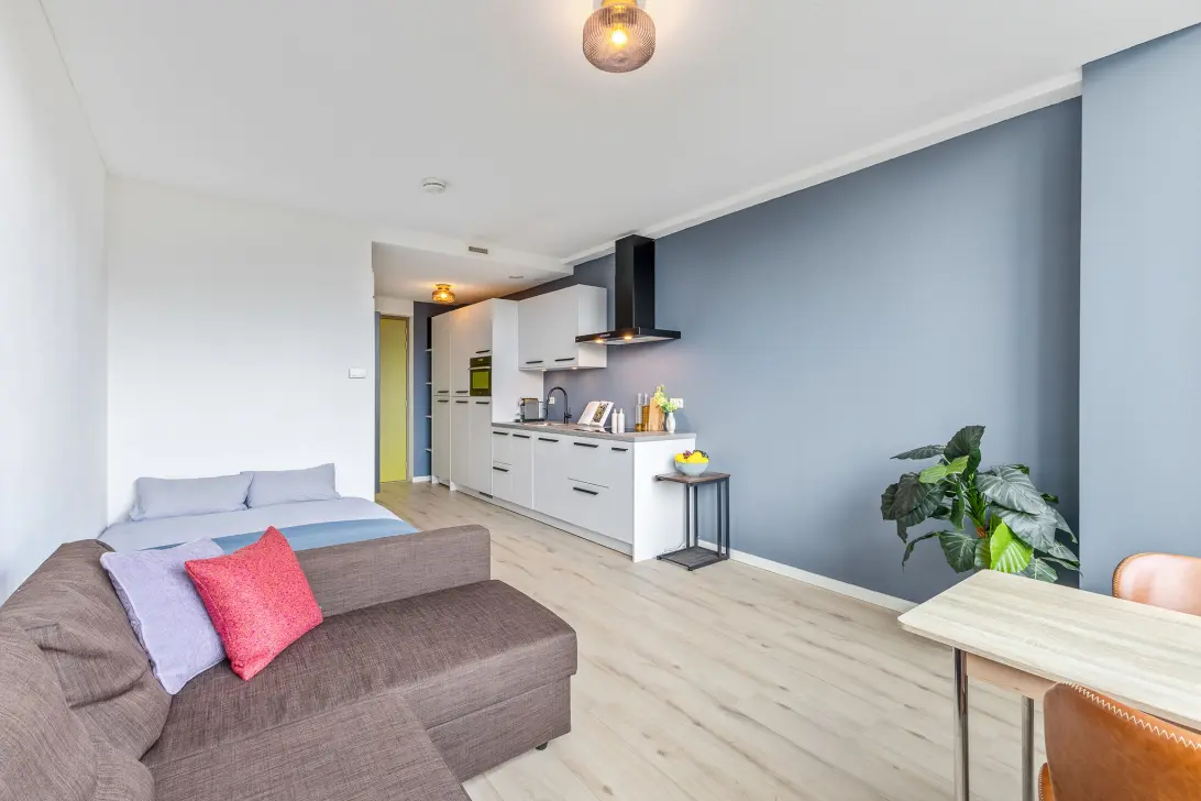 De woonkamer is licht en netjes afgewerkt met een laminaatvloer en gestucte wanden. Er is ruimte genoeg voor een comfortabele zithoek, een werkplek én een bed. Dankzij de grote ramen valt veel daglicht binnen, wat de ruimte een open en prettige sfeer geeft.