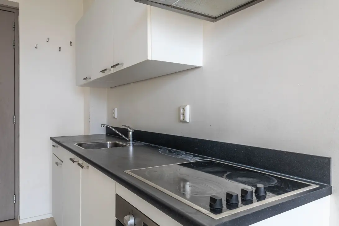 Upon entering, you immediately find yourself in the open kitchen at the front of the studio. The modern kitchen, with a sleek white finish, is equipped with various built-in appliances, including an induction cooktop, refrigerator and freezer, and a stainless steel extractor fan. The bathroom is fully tiled and comes with a sink, toilet, and walk-in shower. The living area is at the back of the studio. The apartment is well-insulated. If desired, you can easily create a separate sleeping area or a work/study space with a room divider. The studio features underfloor heating, underfloor cooling, and air conditioning. There is also an intercom system present.