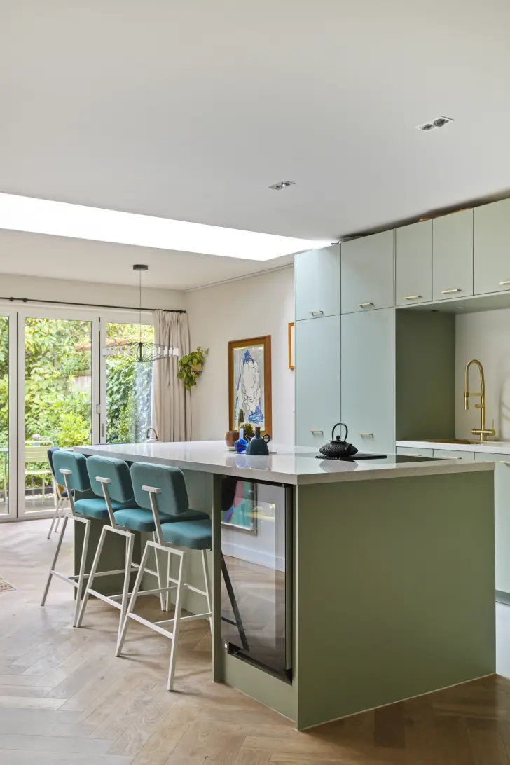 The house has been extended to create a generous living area. The living room, with its bay window and fireplace, exudes charm, while the luxurious open-plan kitchen with a large kitchen island comes equipped with built-in appliances such as a dishwasher, boiling-water tap, wine fridge, and a large fridge and freezer. A wide sliding door with bi-fold panels opens to the sunny south-facing rear garden.