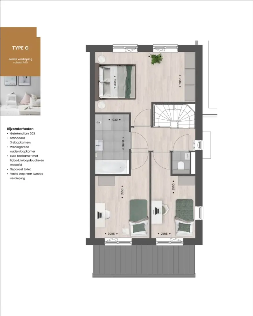 Ook de verdiepingen zijn naar wens in te delen. Op de eerste verdieping kun je de badkamer vergroten voor meer comfort, of twee slaapkamers samenvoegen tot één royale hoofdslaapkamer met bijv. een inloopkast. Op de tweede verdieping richt je met diverse indelingsopties een volwaardige woonlaag in, met bijvoorbeeld twee extra slaapkamers, een tweede badkamer en een praktische was-/bergruimte.